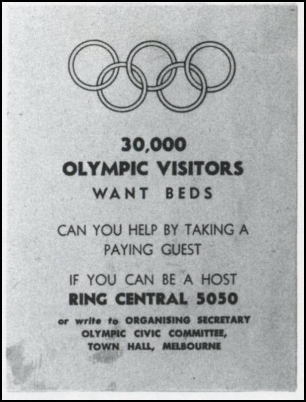 Accommodation Appeal Labels: The two following over-sized labels of 1955 were included with telephone bills. 3. "30,000 OLYMPIC VISITORS Want Accommodation - Be an Olympic Host to a Paying Guest RING CENTRAL 5050 (Fifty Fifty) or WRITE ORGANISING SECRETARY, OLYMPIC CIVIC COMMITTEE, TOWN HALL, MELBOURNE" - Red Olympic rings under last four lines of text. 49x54mm (63x65.5mm overall), imperforate, gummed; color: blue text on yellow paper ... Rare 3a. "30,000 OLYMPIC VISITORS WANT BEDS CAN YOU HELP BY TAKING A PAYING GUEST - IF YOU CAN BE A HOST RING CENTRAL 5050 or write to ORGANISING SECRETARY OLYMPIC CIVIC COMMITTEE, TOWN HALL, MELBOURNE"; Olympic rings at top above text (double-lined rings, identical in size and format to those of No.3). 50x82mm (77x102mm overall), imperforate, ungummed; text & rings are red, paper is pale blue ... Rare |