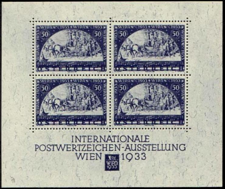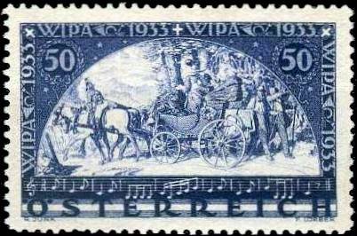 Von der österreichischen Post wurde die berühmte WIPA-Marke mit dem Postkutschenmotiv von Moritz von Schwind herausgegeben. Zum Nennwert von 50 Groschen wurde derselbe Betrag als Zuschlag erhoben. Die Marken erschienen auf gewöhnlichem Papier und Faserpapier. Daneben erschien ein Block mit vier Marken, die sich von den gewöhnlichen Marken durch die abweichende Zahnung unterscheiden.