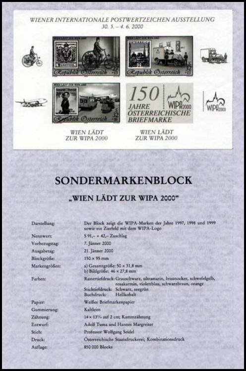In the year 2000 there is once again a WIPA souvenir sheet! Philatelists and non-philatelists alike know these gems, which have become philatelic symbols. With "WIPA 2000" the long tradition of the "Vienna International Philatelic Exhibition" continues. Carrying on the tradition of the prior exhibitions of 1881, 1890, 1933, 1965 and 1981, "WIPA 2000" from 30 May to 4 June 2000 in Vienna's Austria-Center will provide a new peak experience for all.